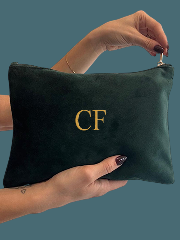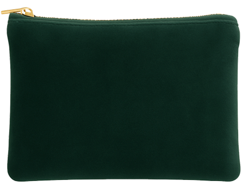 Pochette in effetto velluto. Foderata internamente, chiusura con zip dorata