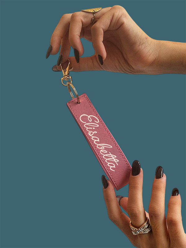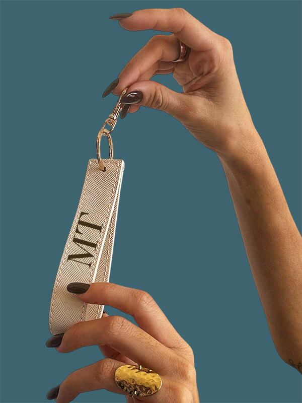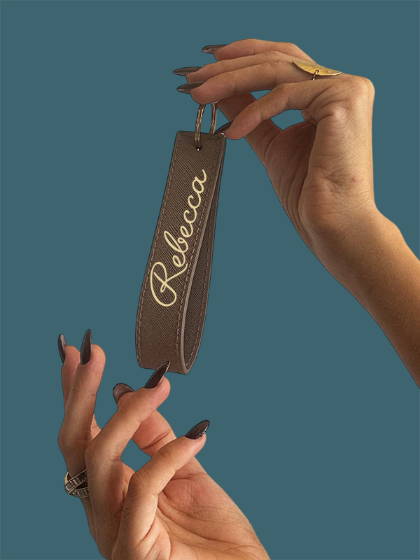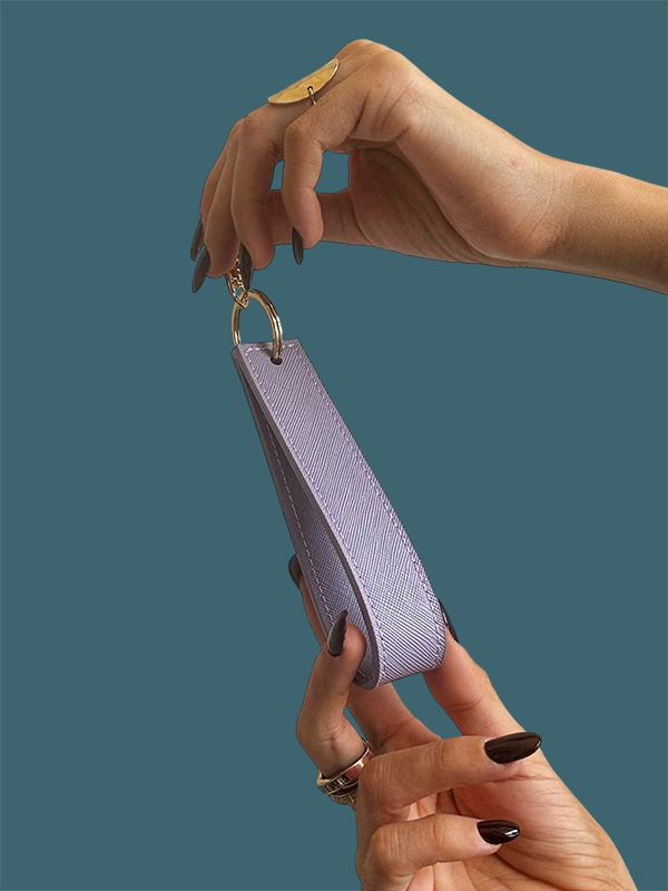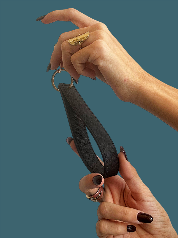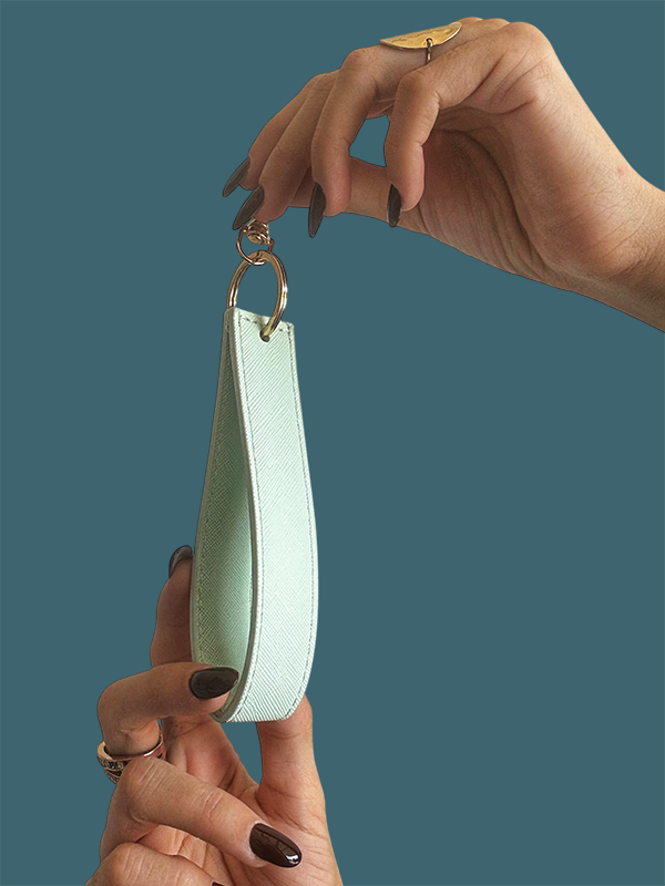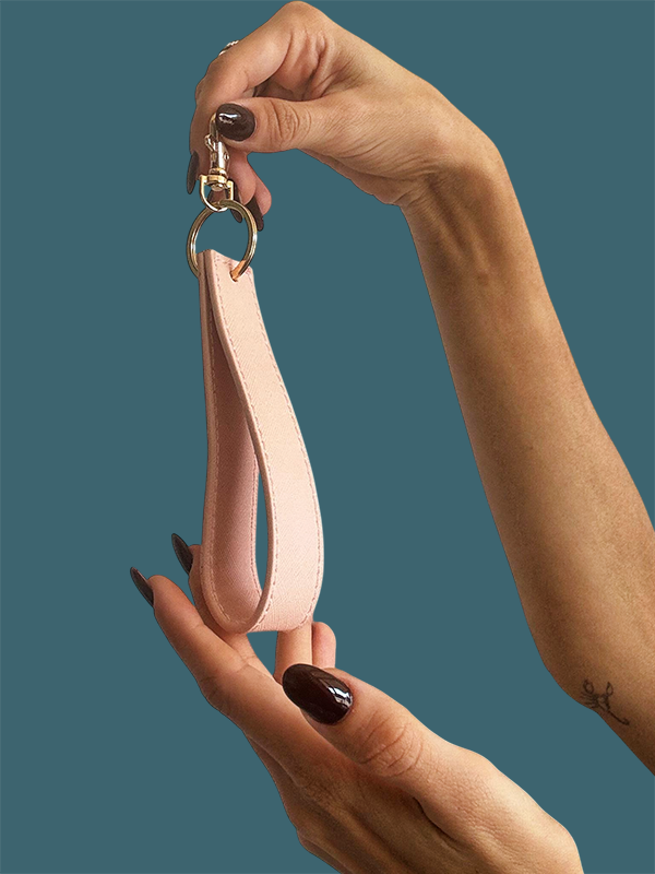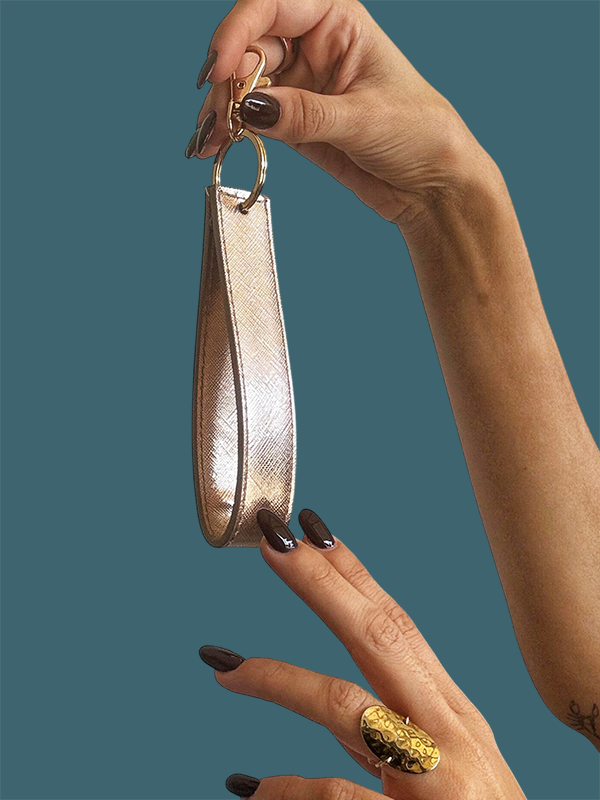 Portachiavi in eco-pelle con moschettone in metallo lucido e cinturino da polso.