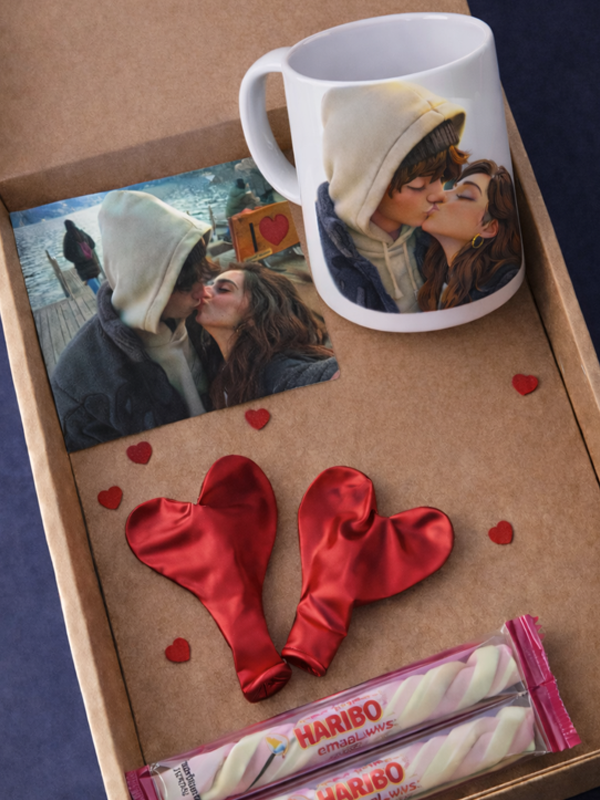 Confezione con scatola personalizzata con palloncini, cuoricini e Mashmellow.