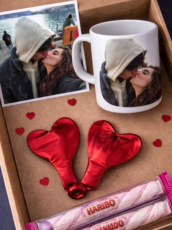 Confezione con scatola personalizzata con palloncini, cuoricini e Mashmellow.