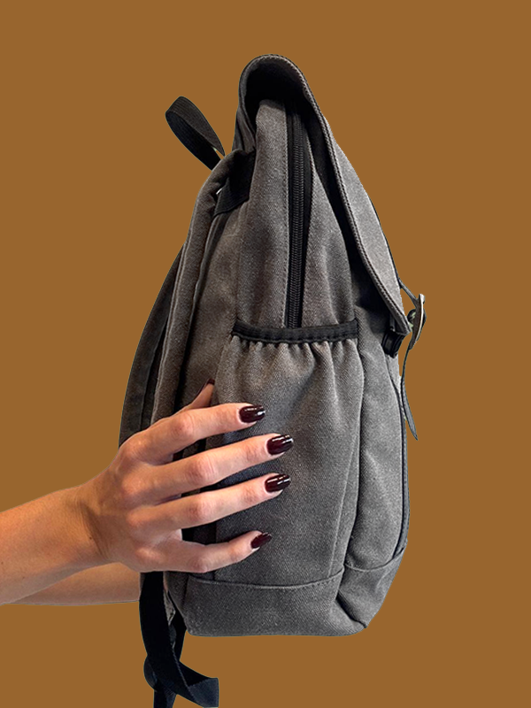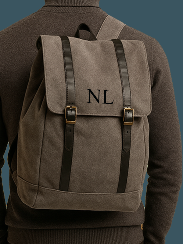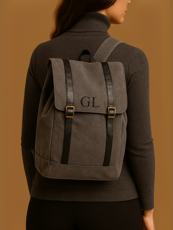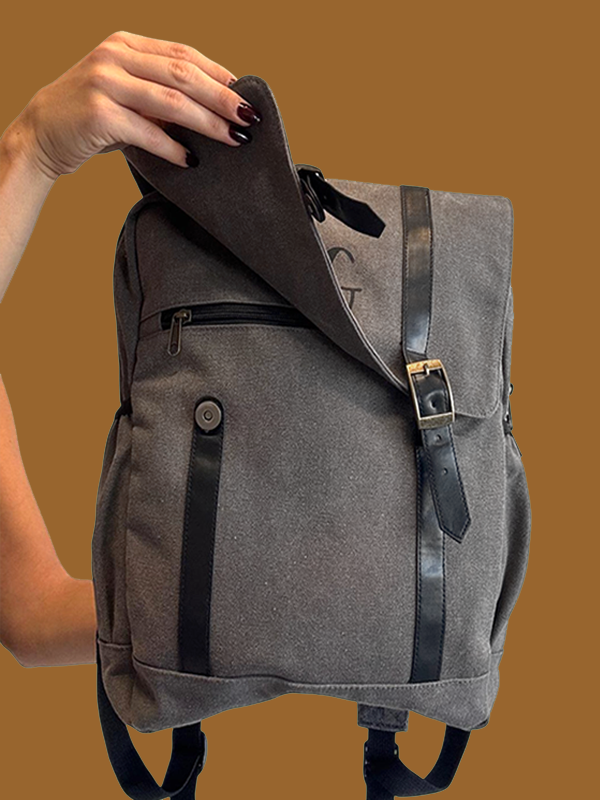 Zaino in tessuto con finiture in contrasto in ecopelle. Spallacci ergonomici e schienale imbottiti. Scomparto interno con zip adatto a contenere tablet e laptop fino a 13".